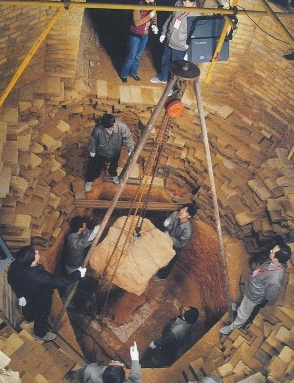 雷峰塔地宮位于雷峰塔中心最下方,發(fā)掘工作的第一步就是起吊壓在雷峰塔蓋板上的頂石,石頭重量極大,普通常人根本無法搬動,考古團隊為了最大程度保護地宮文物,沒有采用吊車、起重臂等大型起重設(shè)備,而是使用了體積小巧、需要人力手動提升的手拉葫蘆。當(dāng)時考古隊員使用撬棒將石蓋板翹起來,又使用鋼絲繩將石頭捆綁起來,再放置在手拉葫蘆的吊鉤上,石蓋板在手拉葫蘆的提升下,逐漸掀開。地宮終于露出它的真實面貌。